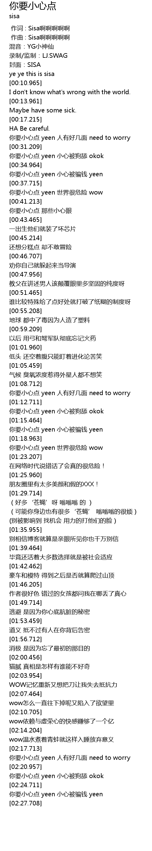 | [02:20.456] | nǐ yào xiǎo xīn diǎn yeen rén yǒu hǎo jǐ miàn need to worry |