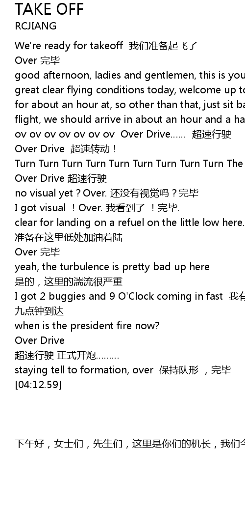 | [00:14.18] | We' re ready for takeoff wo men zhun bei qi fei le |