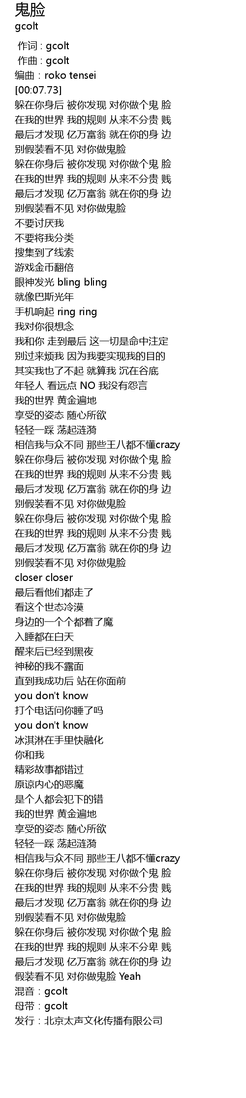 | [00:00.00] | 作词 : gcolt |