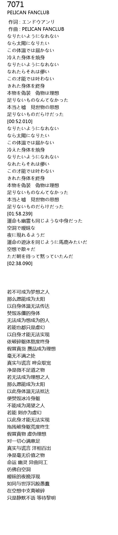 | [00:01.000] | zuò qǔ : PELICAN FANCLUB |