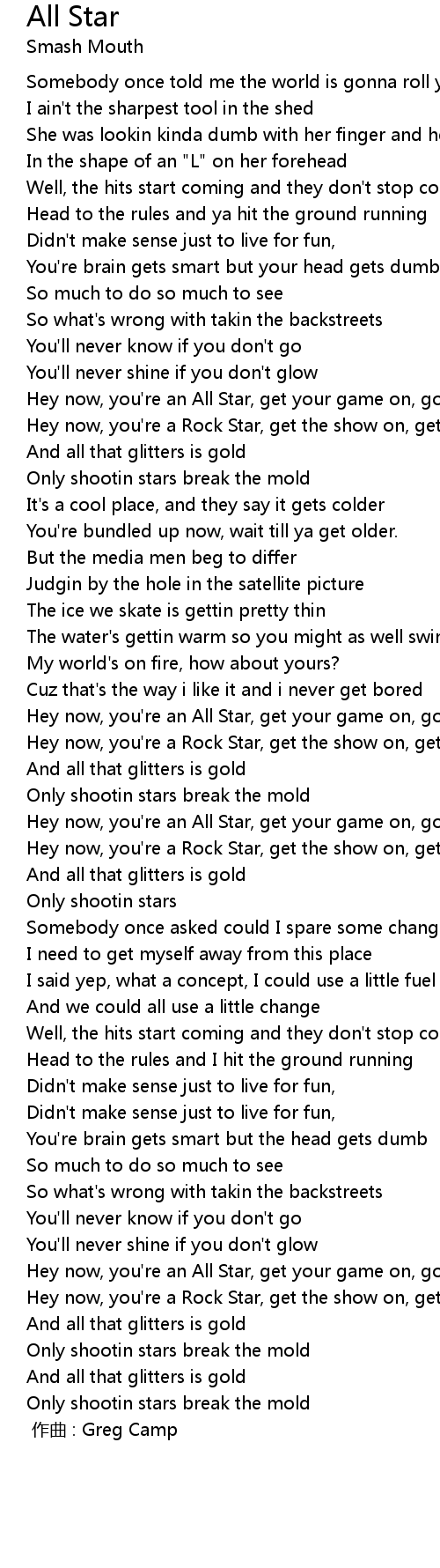 | [01:14] | Hey now, you're an All Star, get your game on, go play |