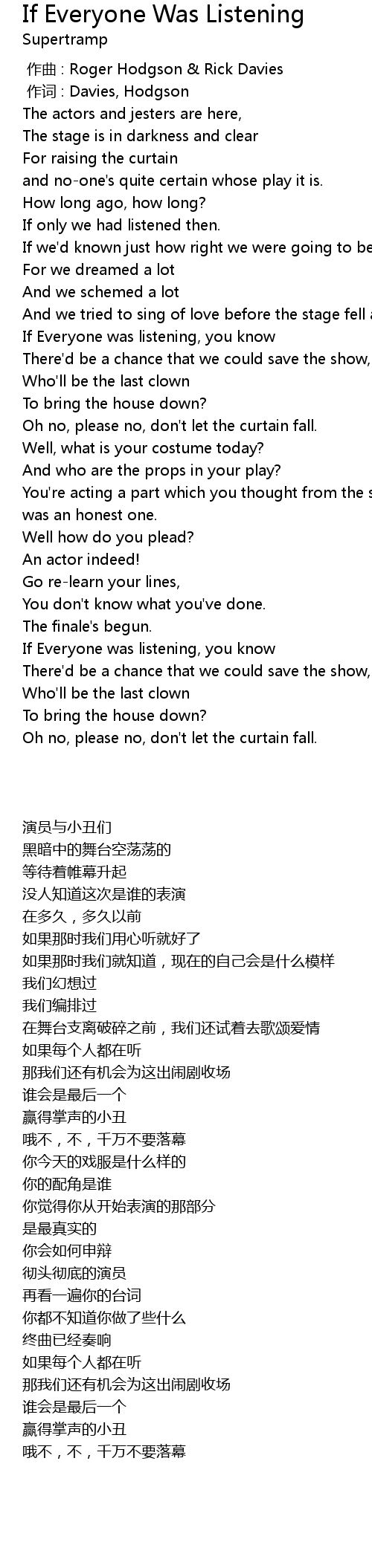 | [00:00.00] | 作曲 : Roger Hodgson & Rick Davies |