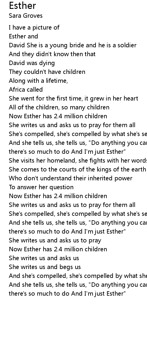 And she tells us, she tells us, "Do anything you can to help Oh please help, there's so much to do And I'm just Esther" |