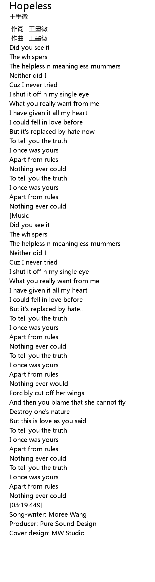 | [03:20.452] | Song-writer: Moree Wang |