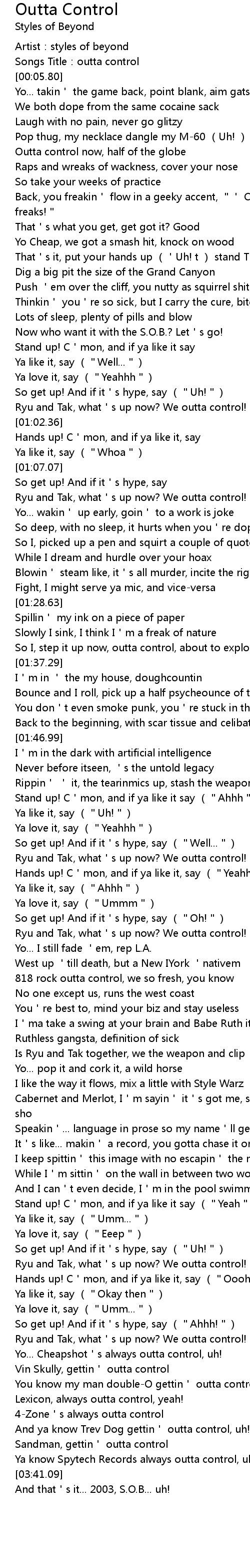 | [03:24.32] | You know my man doubleO gettin outta control, uh! |