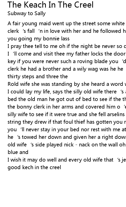 | I could lay my life, says the silly old wife there‘s a man in our daughter‘s bed the old man he got out of bed to see if the thing was true but she‘s taken the bonny clerk in her arms and covered him o‘er with blue up then got the old silly wife to see if it were true and she fell arselins in the creel and up the string they drew if that foul thief has gotten you may he hold you so tight for you‘ll never stay in your bed nor rest with me at night he‘s towed her up, he‘s towed her down and given her a right down - fall till every rib an the old wife‘s side played nick - nack on the wall oh the blue, the bonnie bonnie blue and | |