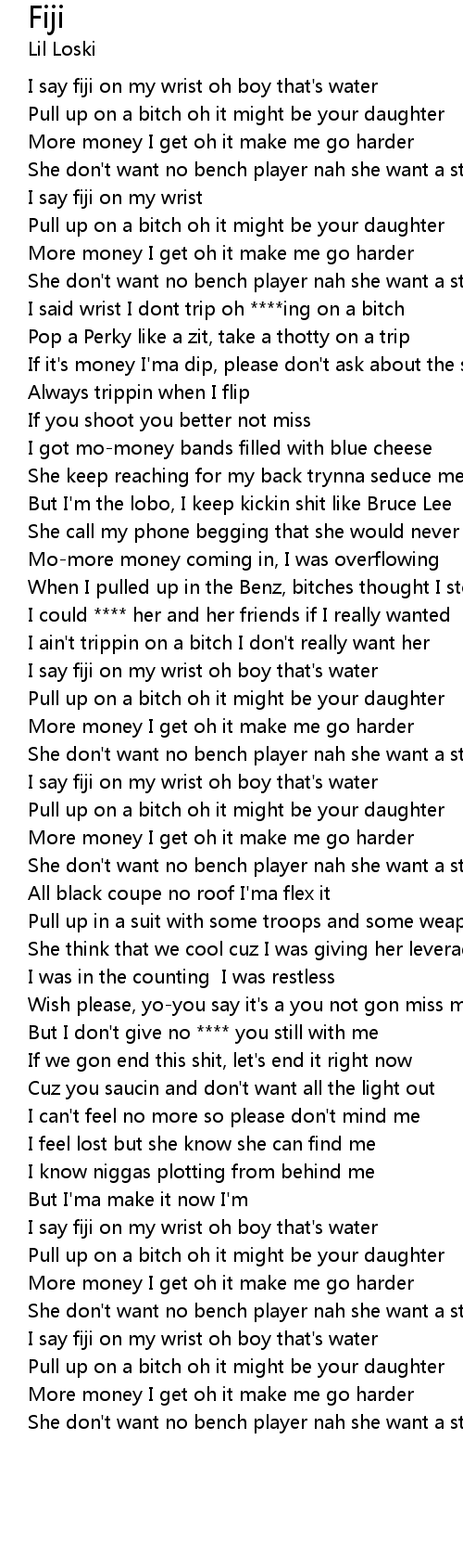 | [00:11.27] | I say fiji on my wrist oh boy that's water |