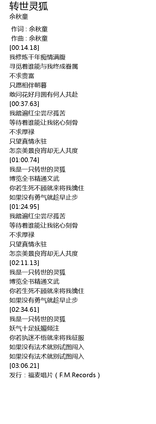 | [02:35.10] | 我是一只转世的灵狐 |
