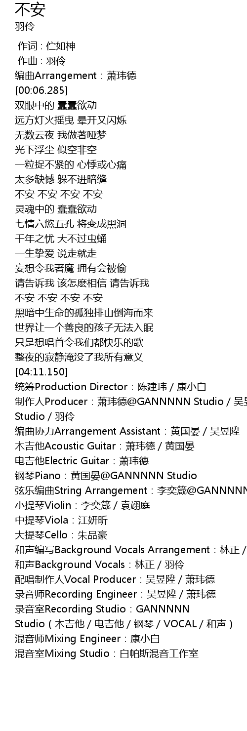 | [04:22.216] | 制作人Producer:萧玮德@GANNNNN Studio/吴昱陞@GANNNNN Studio/羽伶 |