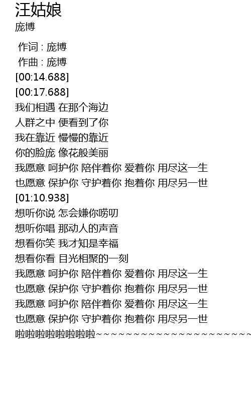 | [01:42.940] | 我愿意 呵护你 陪伴着你 爱着你 用尽这一生 |