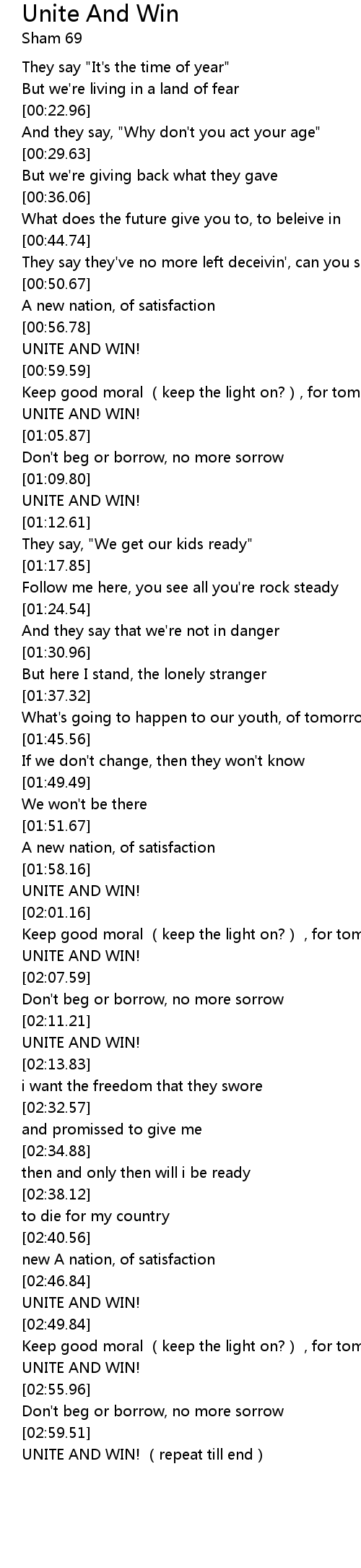 | [03:00.48] | UNITE AND WIN! (repeat till end) |