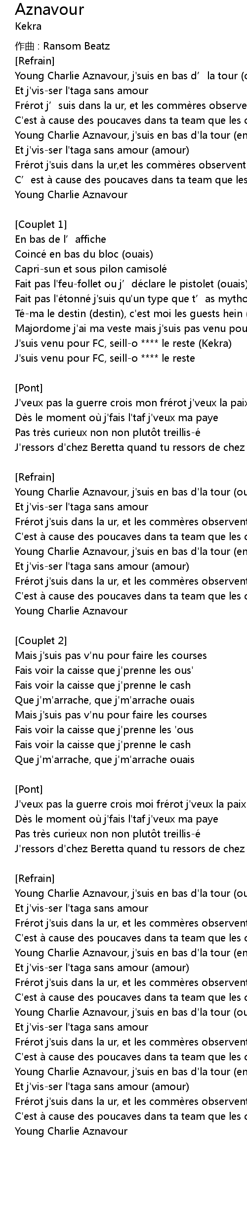 | Young Charlie Aznavour, j'suis en bas d'la tour (en bas d'la tour, ouais) | |