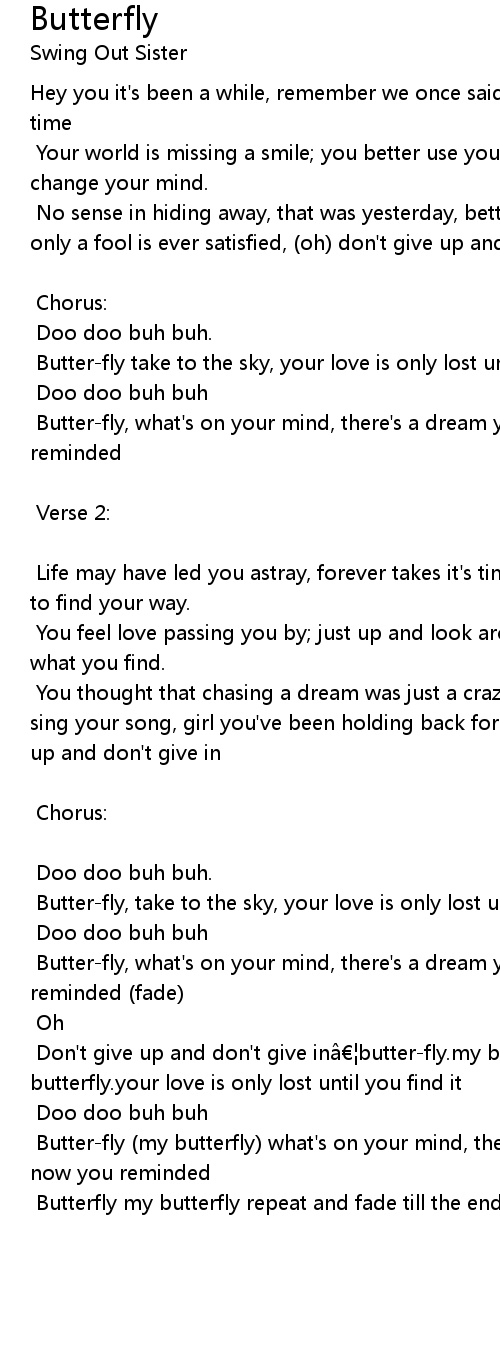 | Don' t give up and don' t give in butterfly. my butterfly butterfly my butterfly. your love is only lost until you find it | |