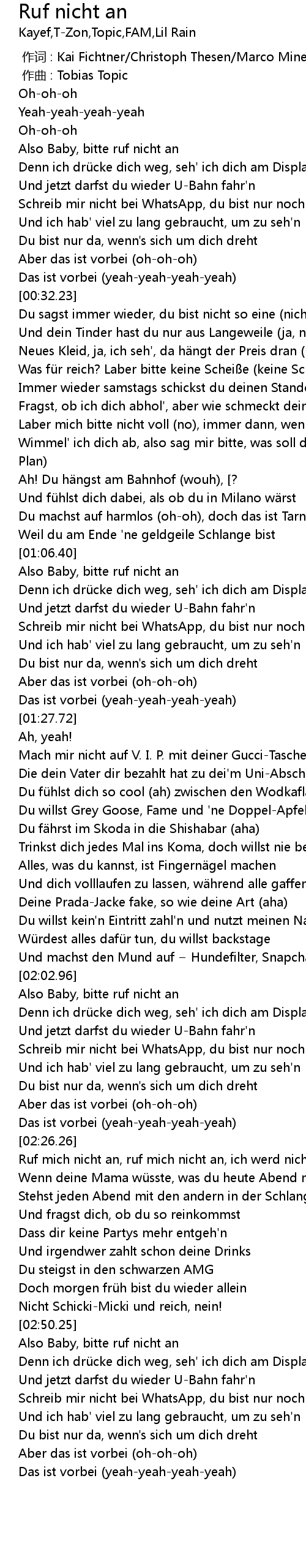 | [00:49.58] | Laber mich bitte nicht voll (no), immer dann, wenn du mich callst (yo) |