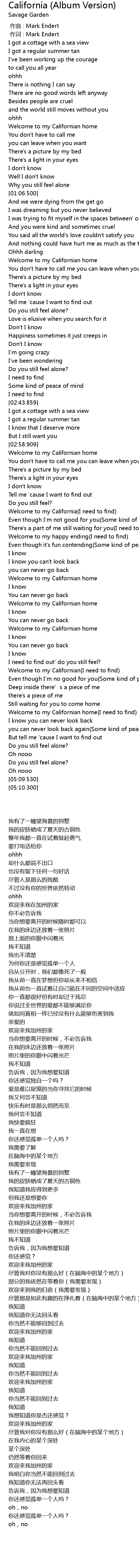 | [04:44.140] | Welcome to my Californian home(I need to find) |