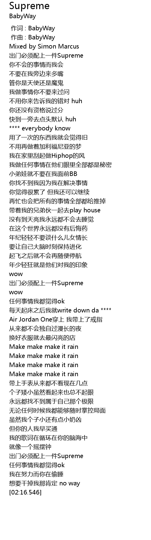 | [00:18.655] | chū mén bì xū pèi shàng yī jiàn Supreme |