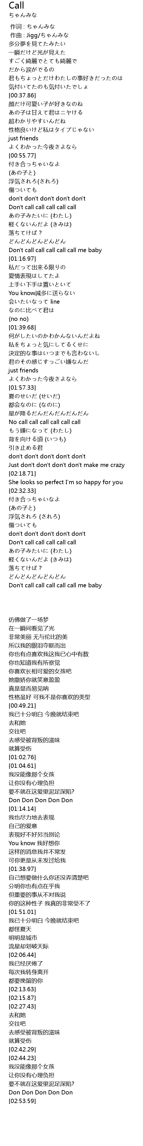 | [00:01.00] | 作曲 : Jigg/ちゃんみな |