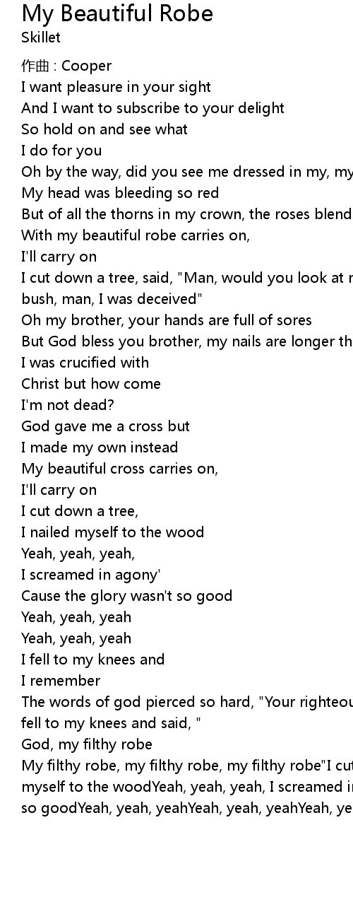 | My filthy robe, my filthy robe, my filthy robe"I cut down a tree and I nailed myself to the woodYeah, yeah, yeah, I screamed in agony'Cause the glory wasn't so goodYeah, yeah, yeahYeah, yeah, yeahYeah, yeah, yeah |