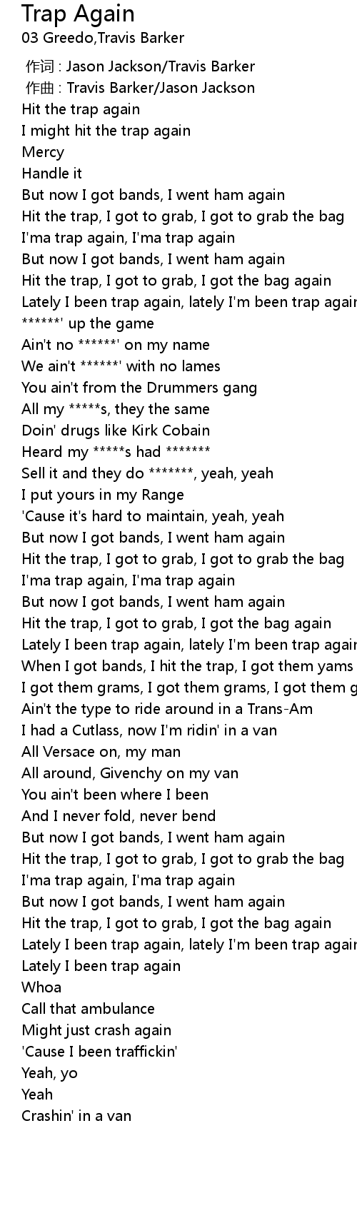 | [00:31.10] | Lately I been trap again, lately I'm been trap again |