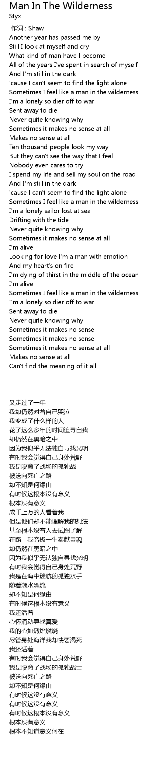 | [02:22.20] | Sometimes I feel like a man in the wilderness |
