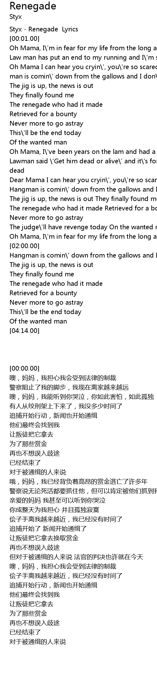 | [00:00.00] | Styx - Renegade Lyrics |