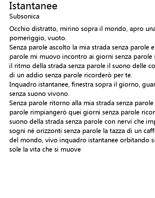 | Senza parole ascolto la mia strada senza parole e il tempo di decidere senza parole mi muovo incontro ai giorni senza parole ricordero di te senza parole e il ritmo della strada senza parole il suono delle cose senza parole il silenzio di un addio senza parole ricordero per te. | |