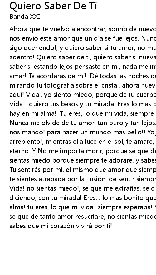 | Ahora que te vuelvo a encontrar, sonri o de nuevo! la luz de la bella ciudad, nos envi o este amor que un di a se fue lejos. Nunca es tarde para empezar, te sigo queriendo!, y quiero saber si tu amor, no murio!, si en verdad lo llevas adentro! Quiero saber de ti, quiero saber si nuevamente me vas a amar, quiero saber si estando lejos pensaste en mi, nada me importa porque quiero volverte a amar! Te acordaras de mi!, De todas las noches que en velas soli a pasar, mirando tu fotografi a sobre el cristal, ahora nuevamente sonri o porque estas aqui! Vida... yo siento miedo, porque de tu cuerpo, no tengo nada. Vida.... quiero tus besos y tu mirada. Eres lo mas bonito que hay en mi vida! que hay en mi alma!. Tu eres, lo que mi vida, siempre esperaba! Ay!! | |