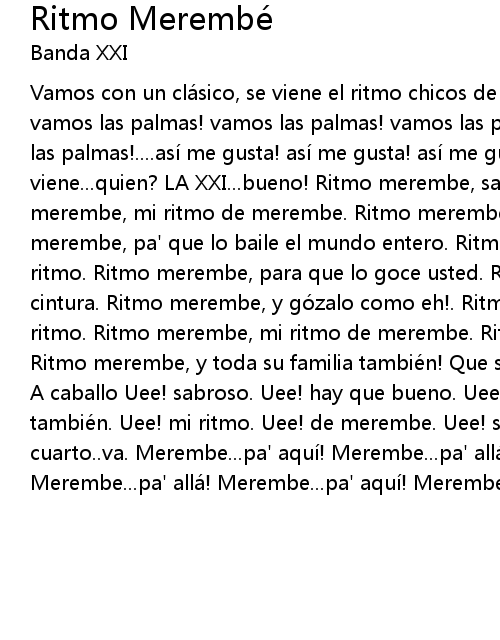 | Vamos con un cla sico, se viene el ritmo chicos de la xxi, y se viene....... vamos las palmas! vamos las palmas! vamos las palmas! vamos las palmas! vamos las palmas!.... asi me gusta! asi me gusta! asi me gusta! Se viene... quien? Se viene... quien? LA XXI... bueno! Ritmo merembe, sabroso que esta mi ritmo. Ritmo merembe, mi ritmo de merembe. Ritmo merembe, nacio gracias a Rio Cuarto. Ritmo merembe, pa' que lo baile el mundo entero. Ritmo merembe, sabroso que esta mi ritmo. Ritmo merembe, para que lo goce usted. Ritmo merembe, moviendo bien la cintura. Ritmo merembe, y go zalo como eh!. Ritmo merembe, sabroso que esta mi ritmo. Ritmo merembe, mi ritmo de merembe. Ritmo merembe, lo goza don cococita. Ritmo merembe, y toda su familia tambie n! Que siga! Que siga! LA BANDA XXI | |