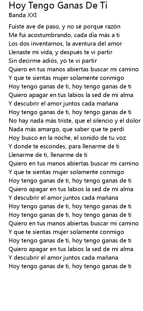| Hoy tengo ganas de ti, hoy tengo ganas de ti |