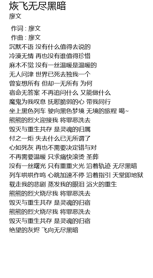 | [04:13.446] | 没有一丝曙光 只有重重火光 沿着轨迹 无尽黑暗 |