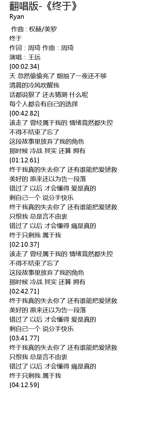 | [03:42.06] | zhōng yú wǒ zhēn de shī qù nǐ le hái yǒu shuí néng bǎ ài zhěng jiù |