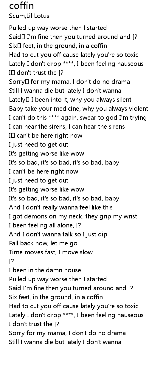 | [00:21.23] | Six feet, in the ground, in a coffin |