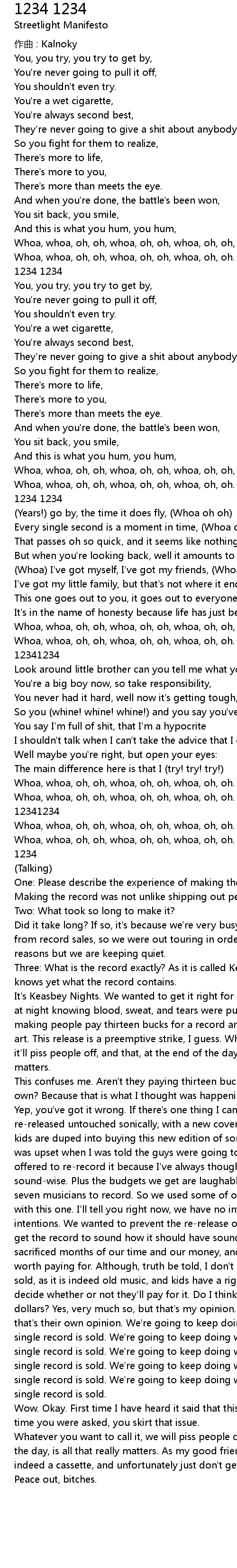 | It' s Keasbey Nights. We wanted to get it right for once. Plus it helps me sleep at night knowing blood, sweat, and tears were put into a record as opposed to making people pay thirteen bucks for a record and they only get flashy new cover art. This release is a preemptive strike, I guess. Whatever you want to call it, it' ll piss people off, and that, at the end of the day, is all that really matters. | |