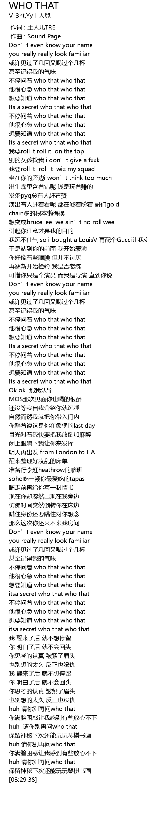 | [03:15.88] | huh qǐng nǐ bié zài wèn who that |