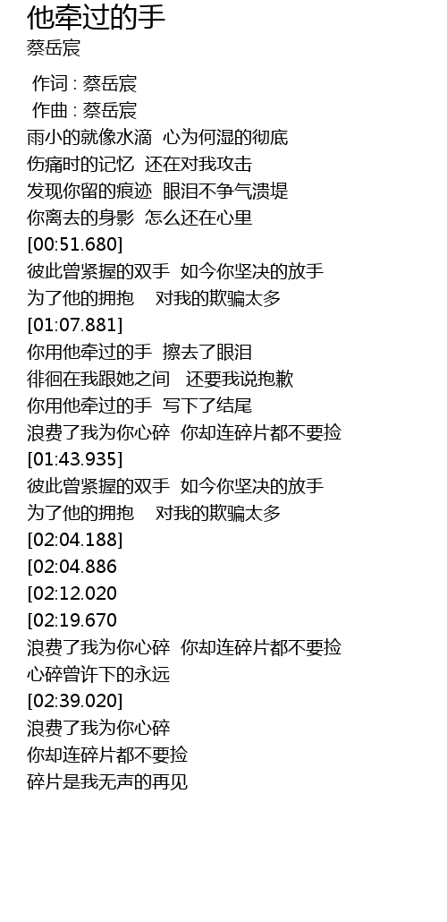 | [03:04.921][02:19.670] | 你用他牵过的手 写下了结尾 |