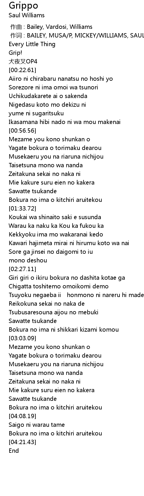 | [00:00.00] | 作词 : BAILEY, MUSA/P, MICKEY/WILLIAMS, SAUL |