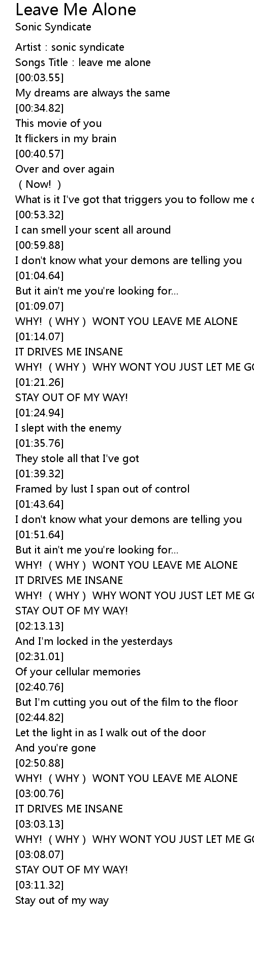 | [02:56.88] | WHY! (WHY) WONT YOU LEAVE ME ALONE |
