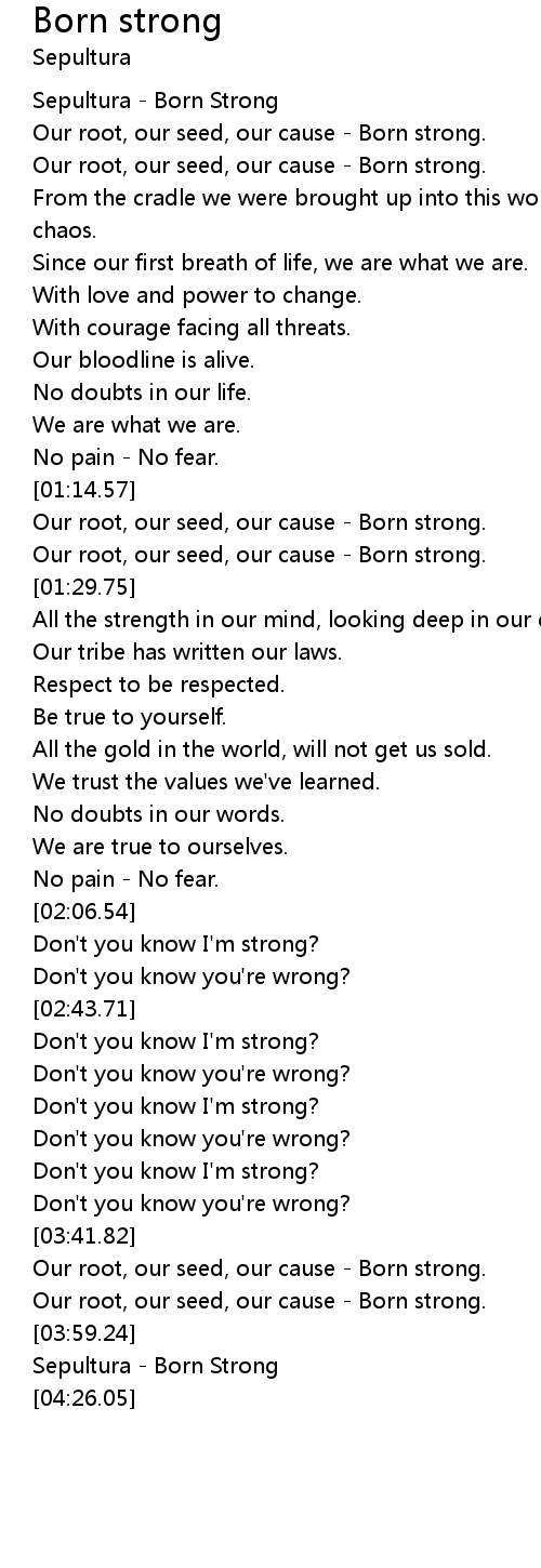 | [03:52.01] | Our root, our seed, our cause - Born strong. |
