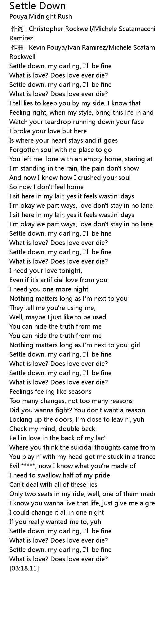 | [03:10.52] | Settle down, my darling, I' ll be fine |