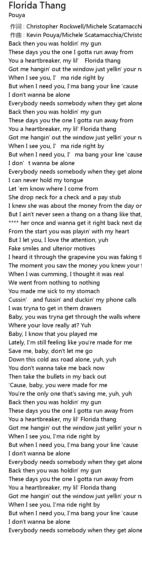 | [00:21.17] | You a heartbreaker, my lil’ Florida thang |