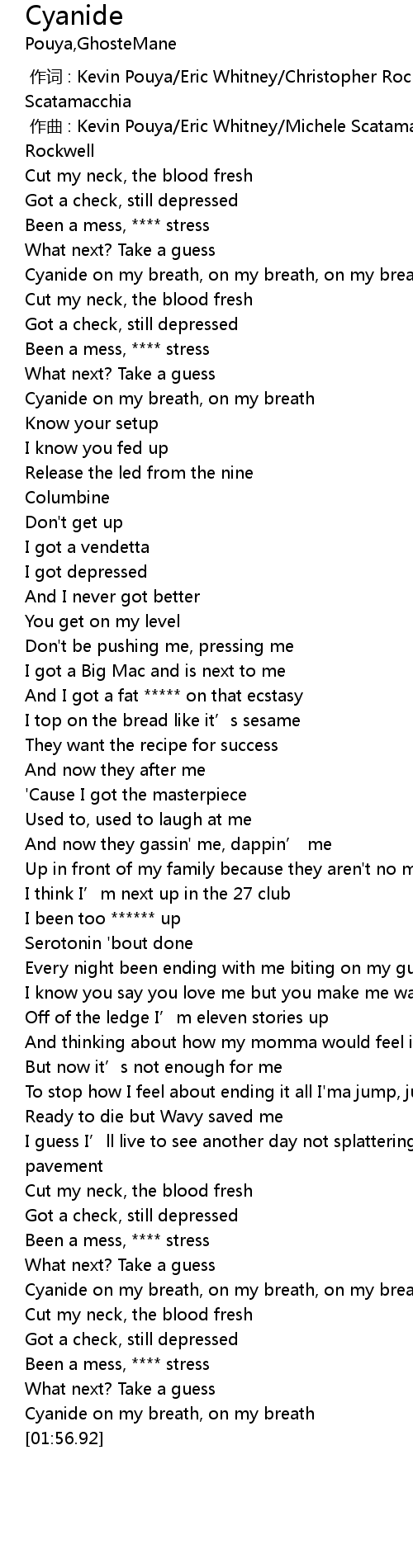 | [01:53.38] | Cyanide on my breath, on my breath |