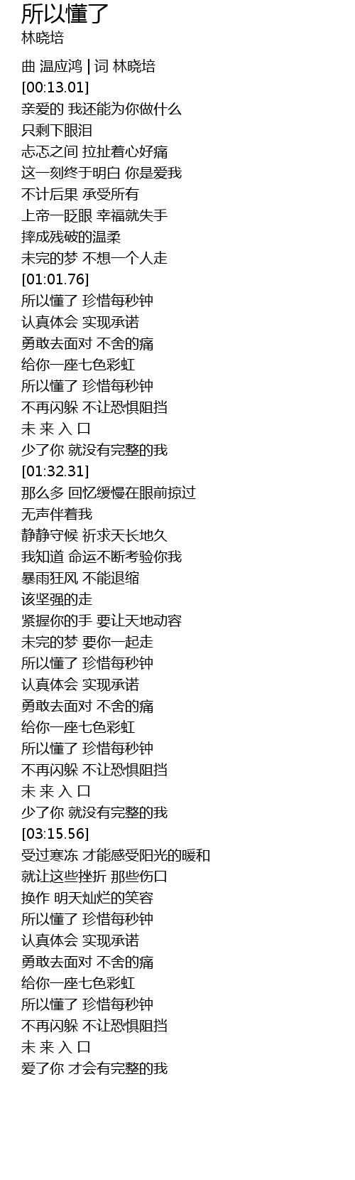 | [01:16.10] | 所以懂了 珍惜每秒钟 |