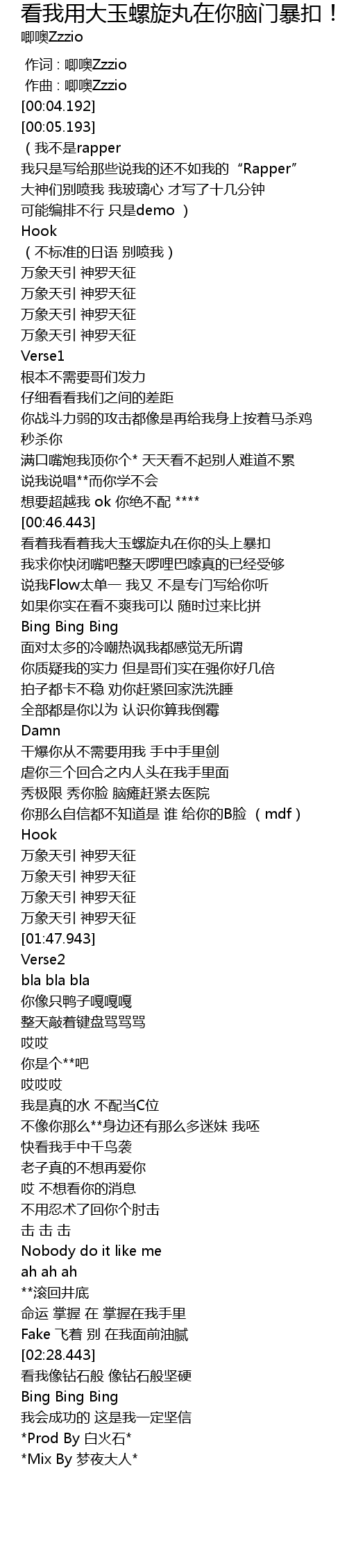 | [00:06.193] | (我不是rapper 我只是写给那些说我的还不如我的“Rapper” |