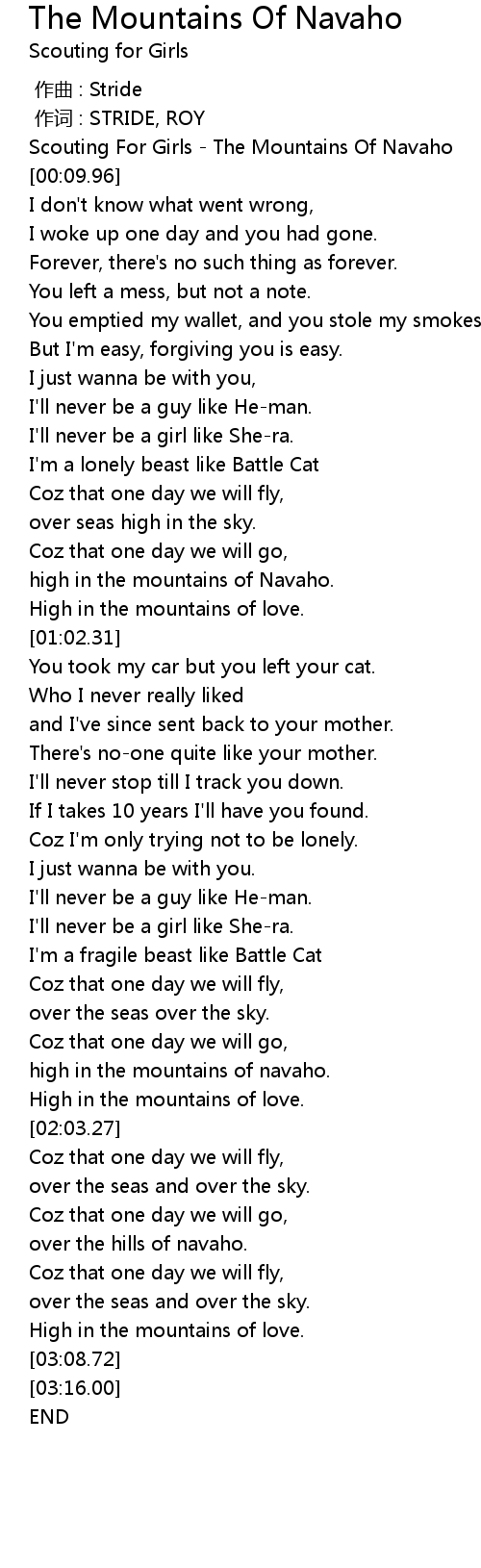 | [00:00.00] | Scouting For Girls - The Mountains Of Navaho |