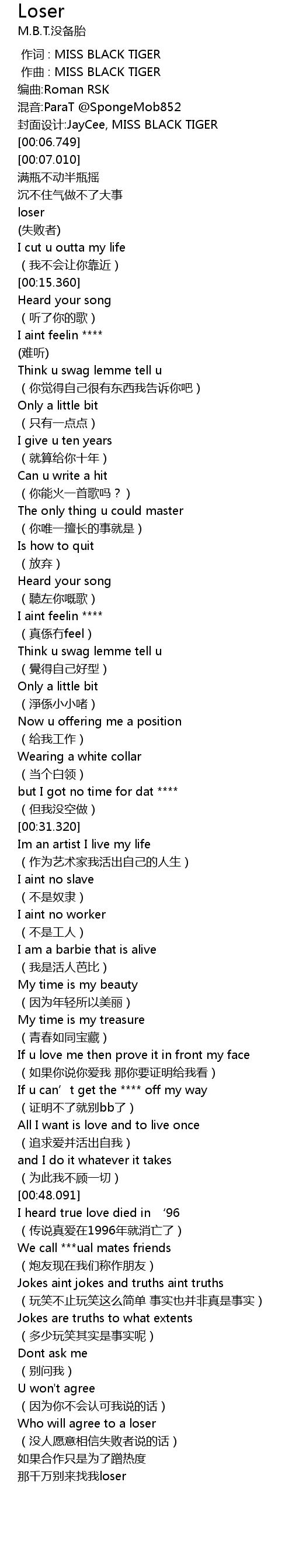 | [00:06.230] | feng mian she ji: JayCee, MISS BLACK TIGER |