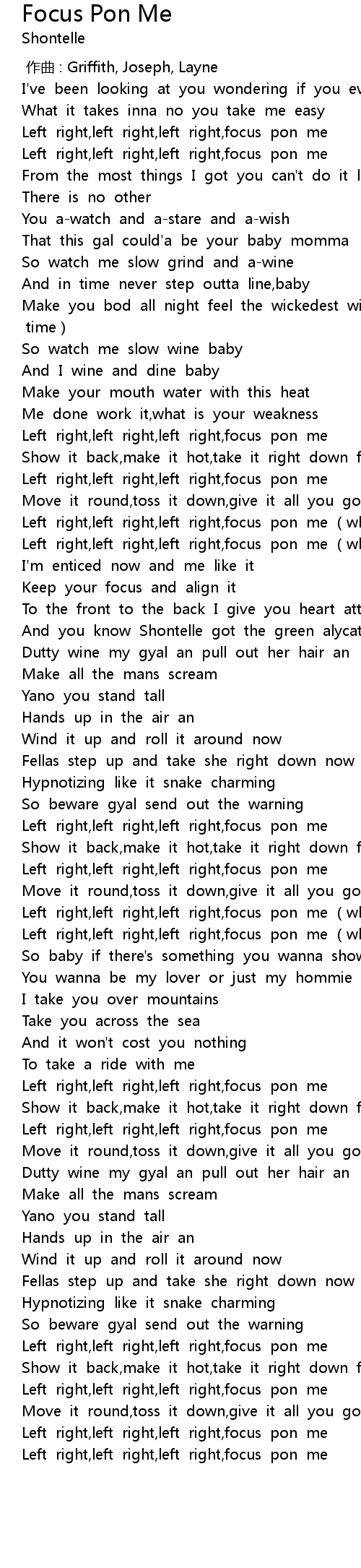 | [00:14.78] | Left right, left right, left right, focus pon me |