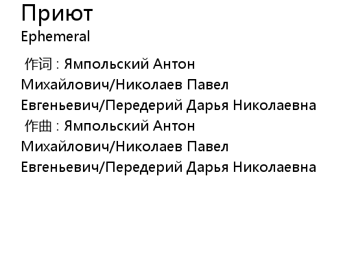 [00:00.00-1] 作曲 : Ямпольский Антон Михайлович/Николаев Павел Евгеньевич/Передерий Дарья Николаевна