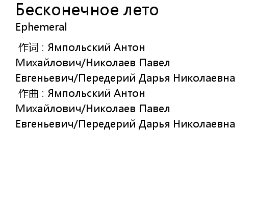 [00:00.00-1] 作曲 : Ямпольский Антон Михайлович/Николаев Павел Евгеньевич/Передерий Дарья Николаевна