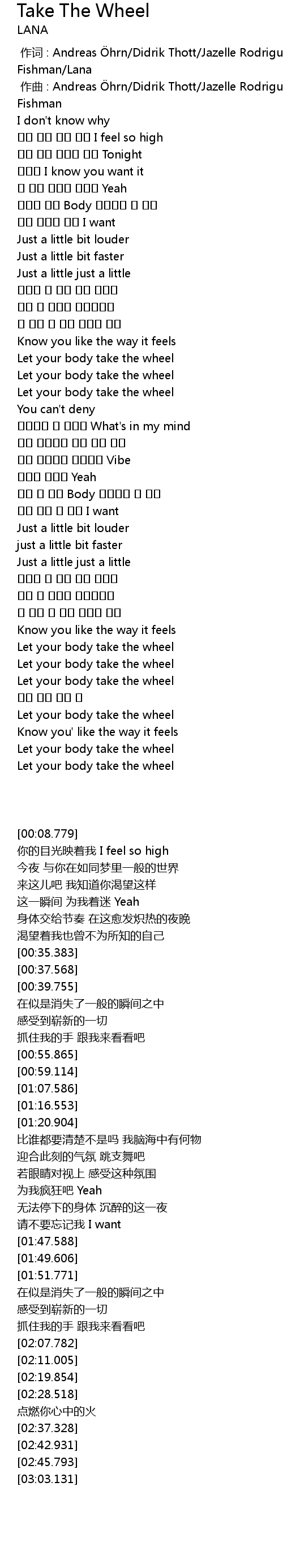 | [00:00.000] | 作词 : Andreas Öhrn/Didrik Thott/Jazelle Rodriguez/Sam (DJ Sam F) Fishman/Lana |