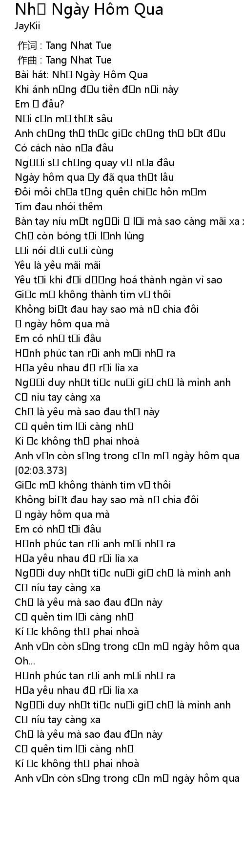 | [00:03.280] | Bà i há t: Nh Ngà y H m Qua |